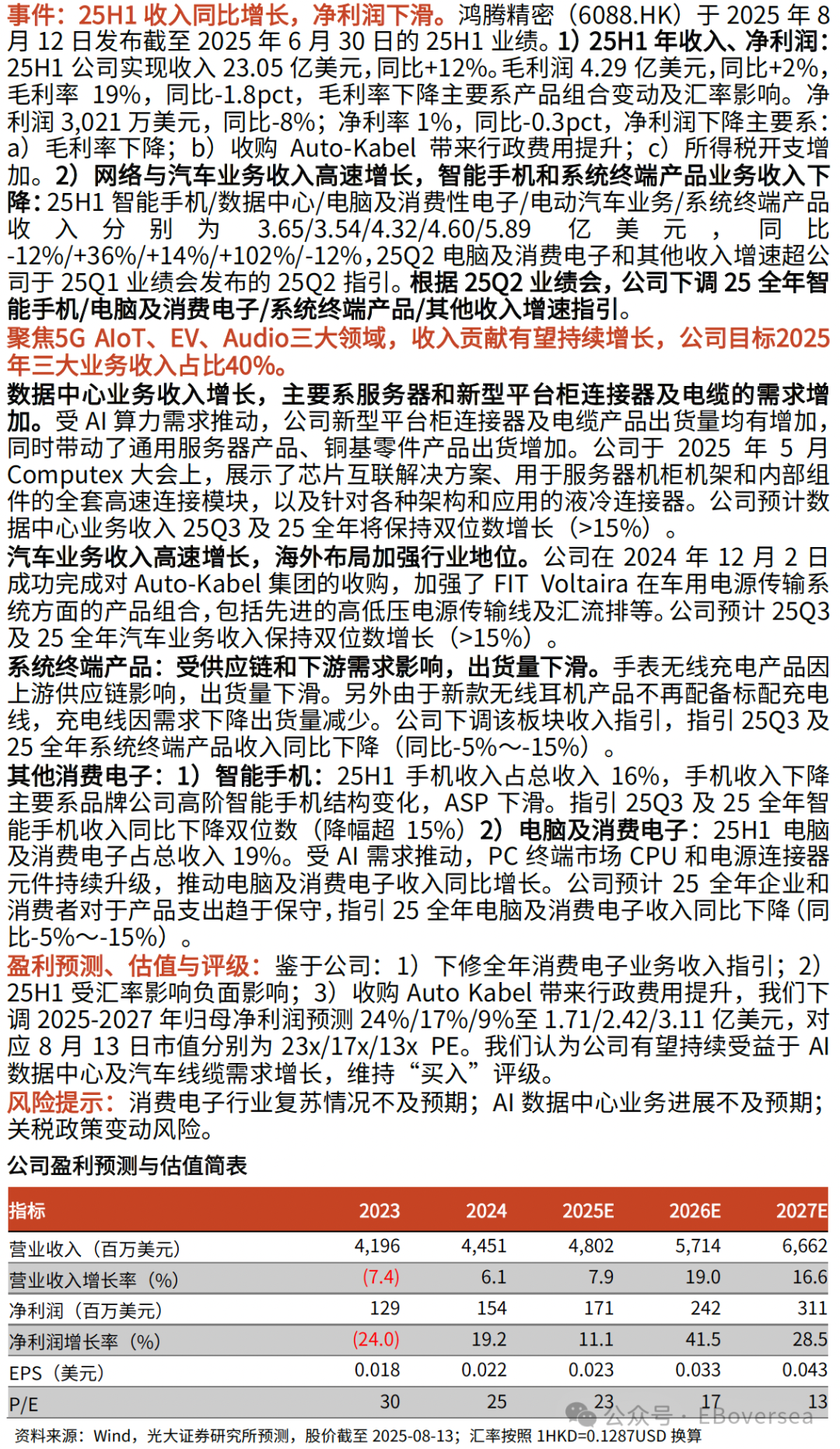 阐明标题:《耗尽电子业务全年收入指点下修,温雅AI数据中心居品线新阐明——鸿腾精密(6088.HK)2025H1事迹点评》