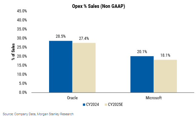 研报强调,把柄翻新后的2029财年基准情景清晰,甲骨文正推进非GAAP运营用度占比接近收入的20%,与此同期微软近期的运营用度也曾章程在20%傍边。