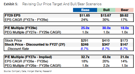 因此尽管2029财年收入预期大幅培植了朝上200亿好意思元,但大摩的基本情景预测,其交易利润率将从2025财年的44%下落至2029财年的39%。2029财年的每股收益(EPS)瞻望落在11.50至12.00好意思元区间(模子具体为11.65好意思元)。
