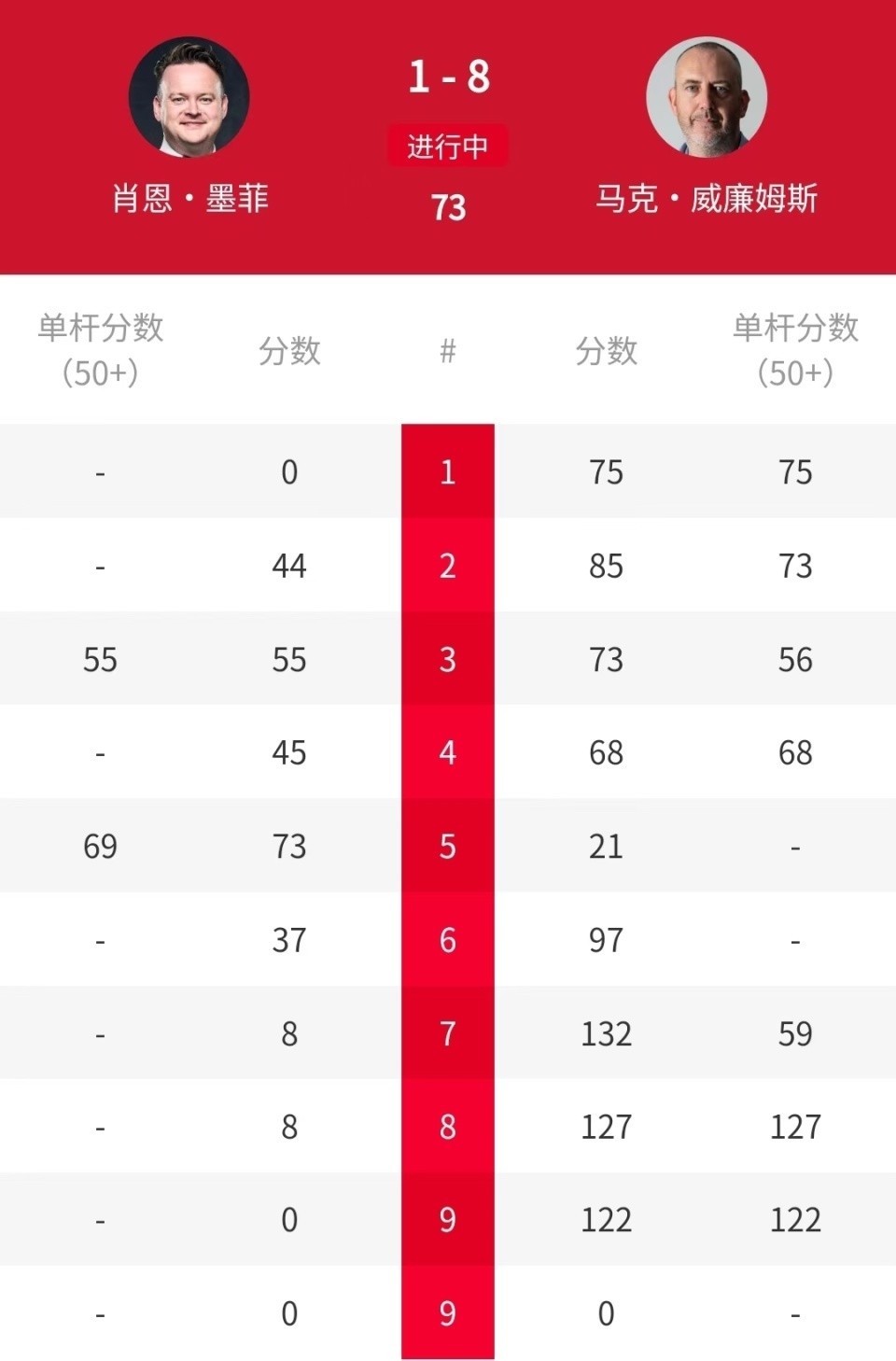 这场比赛,墨菲单杆91分开场,威尔逊随后连扳三局,以3-1反超比分。墨菲一波三连鞭,4-3反超比分,前七局比分为:133(91)-0、25-85(81)、28-84、0-139(139)、81(81)-0、131(131)-0、140(140)-0。